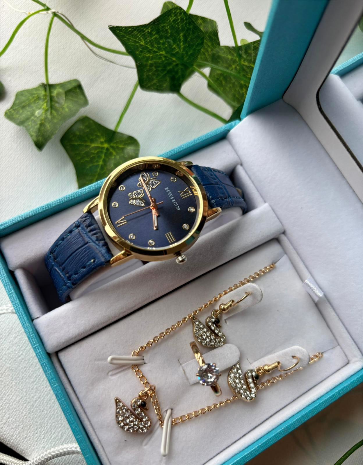 Coffret Montre & Bijoux Femme – Élégance Cygne Bleu & Doré